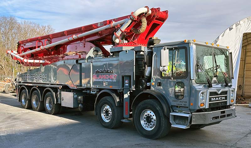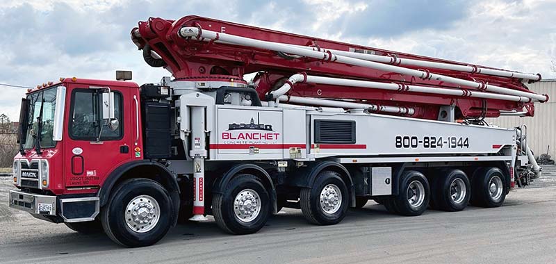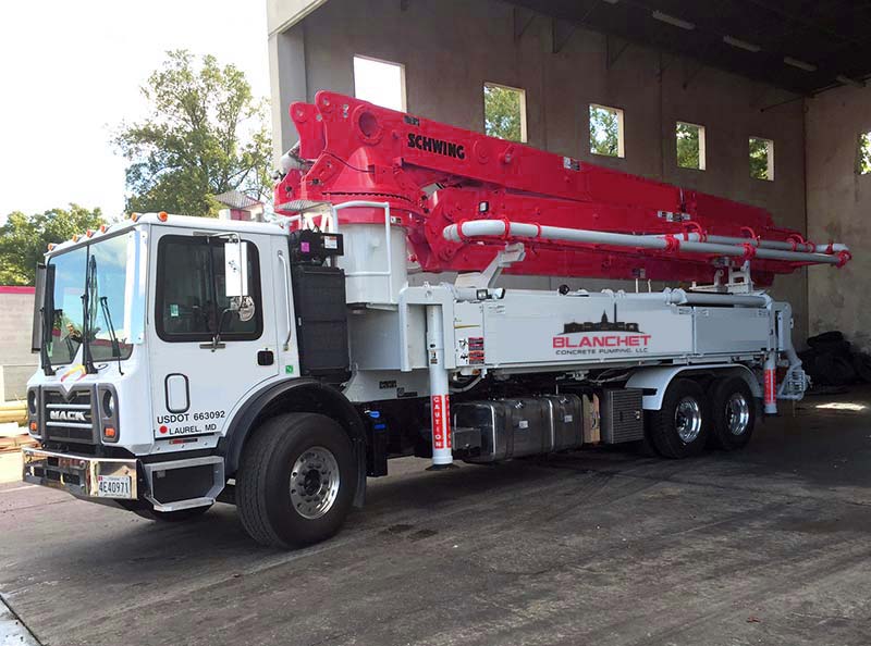 The Schwing S 47 SX Truck-Mounted Concrete Pump features a 5-Section Hyper Extension Roll & Fold placing boom with a 134′ 5″ horizontal reach.