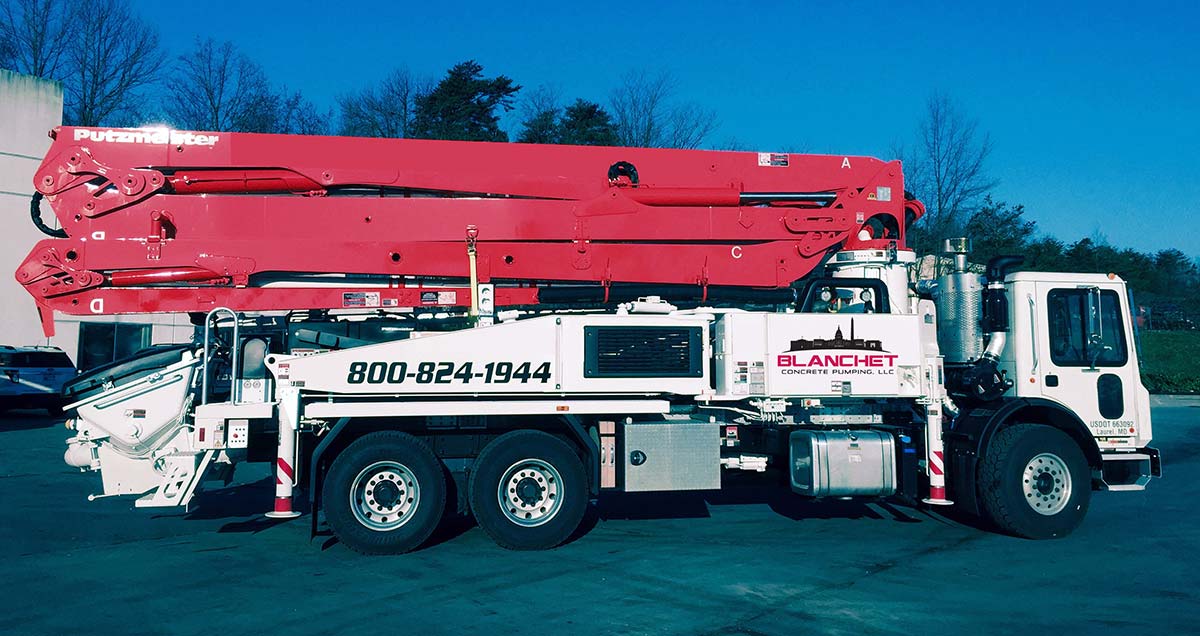 The Putzmeister 47Z Truck-Mounted Concrete Pump features a 4-section placing boom with a 128′ 2″ net horizontal reach.