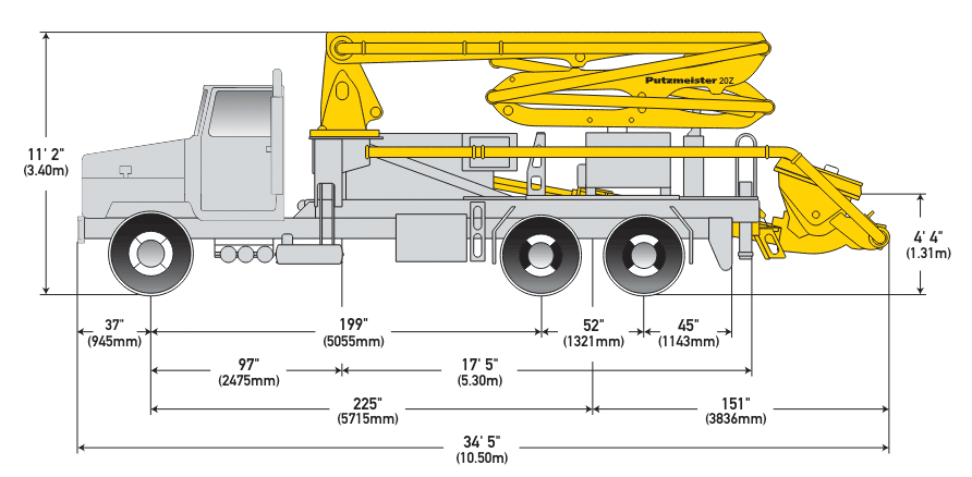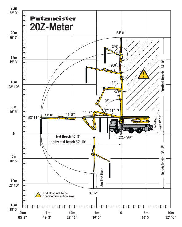 The Putzmeister 20Z-Meter Truck-Mounted Concrete Pump features a versatile four-section Z-Fold boom, with 63 feet 10 inches (19.46 meters) of vertical reach that can operate in challenging places including areas with low ceilings. The compact design allows easy maneuvering through busy, urban job sites.