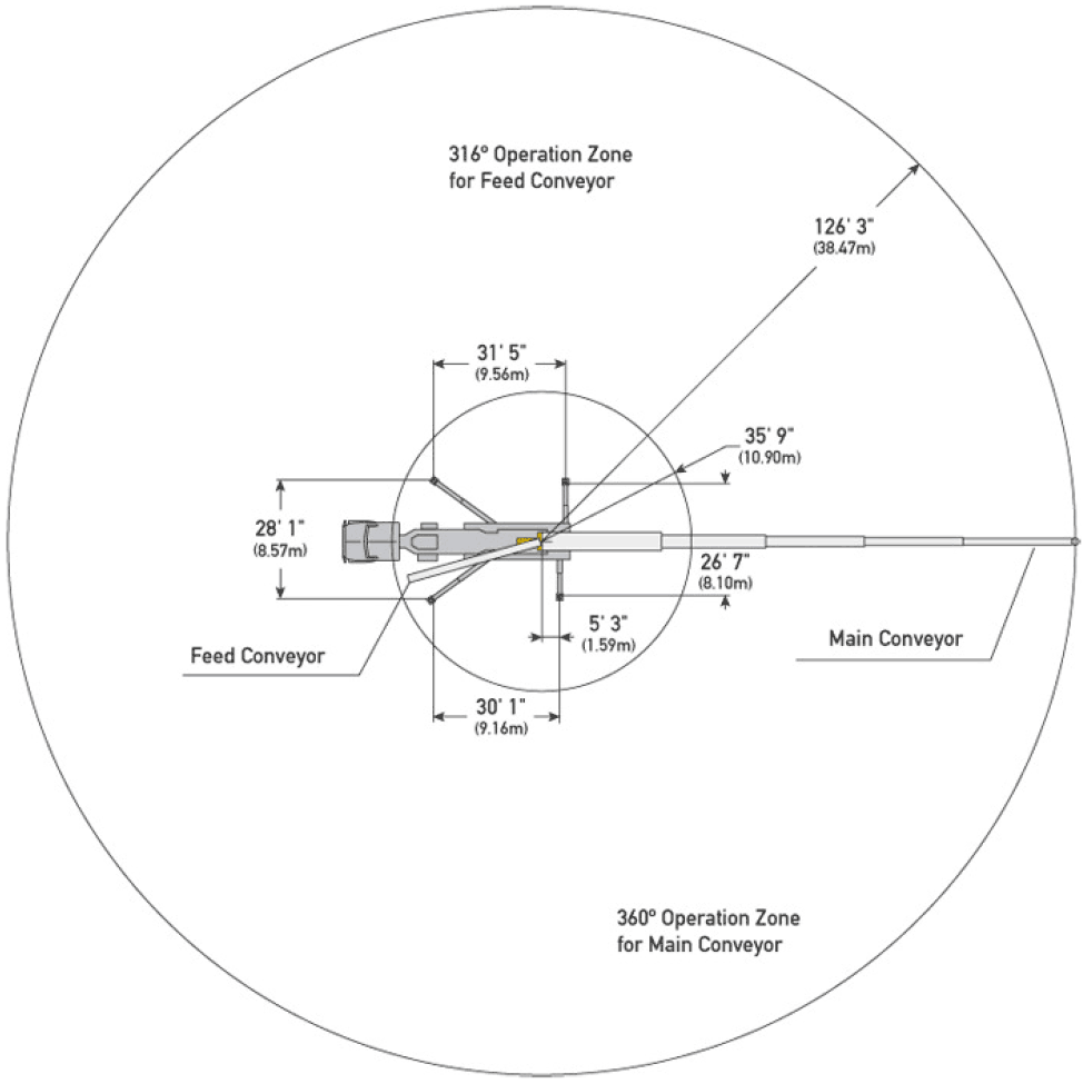 | Conveyor horizontal reach: maximum at 0° | 126’ 6″ | 38.56m |