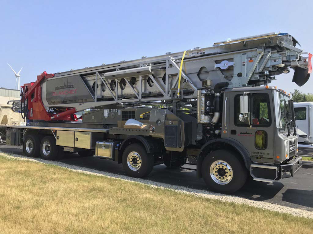 Offering a 126′ 6″ (38.56m) horizontal reach, the TB 130 telebelt features a five-section boom and a fully hydraulic conveyor capable of handling concrete slumps from 0″ to 12″ (0mm to 305mm) and materials from sand to 4″ (100mm) rock. Strong yet lightweight and easy to control, the unit features quick setup using its patented outrigger design. The TB 130 also operates in ceiling heights as low as 15′ 4″ (4.70m).