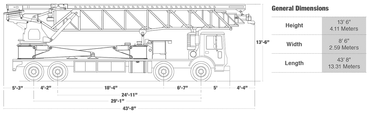 Net reach beyond outriggers Maximum at 0° 100′ 11″ 30.76 m Maximum at 30° 87′ 2″ 26.57 m Outrigger spread L-R front hydraulic out 26′ 1″ 7.95 m Outrigger spread L-R rear hydraulic out 27′ 10″ 8.48 m Outrigger spread front to rear 29′ 11″ 9.12 m