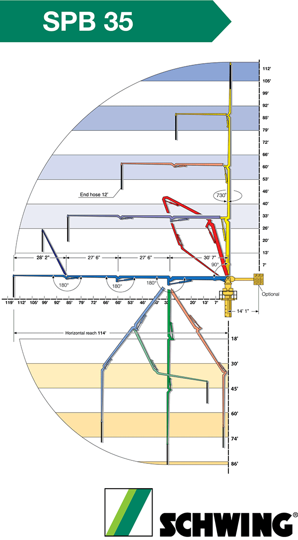 The Schwing SPB 35 is a full articulation, Roll & Fold® design 4-section boom that reaches 114′ and rotates 550 degrees.