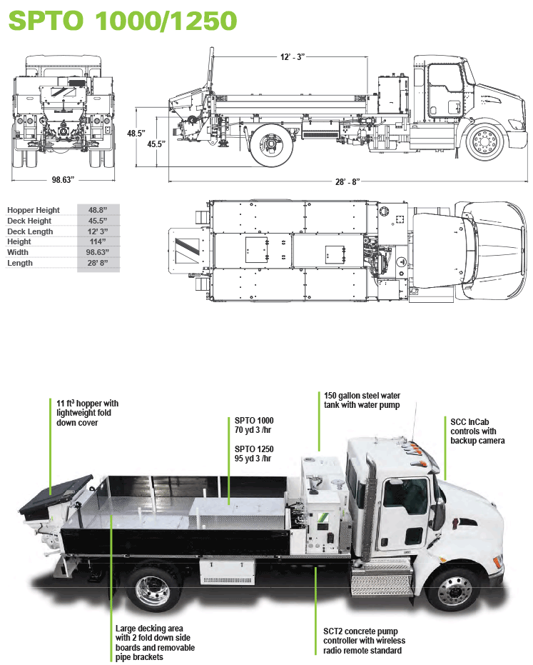 When a boom is not needed, this industry leading truck mounted concrete pump truck has everything you need to pump concrete from patios in your back yard to warehouse slabs. Since no outrigger are needed, this pump can set up in a small footprint to get the job done. With a theoretical concrete output of 95 yards per hour, this pump is textbook for that small 6 yard project or that 300 yard plus project.
